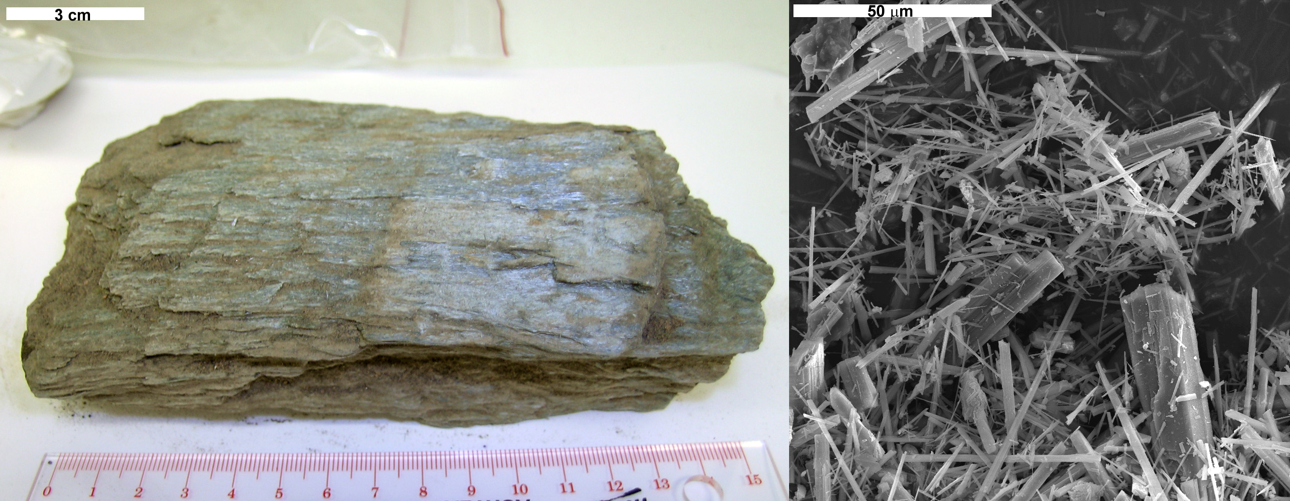 Fibrous to asbestiform richterite/magnesioriebeckite collected near Gem Park, Colorado. Hand sample (left) and scanning electron micrograph (right) are shown.