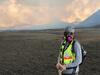 Field crews must be prepared for hazards in the lower East Rift Zone. Pictured, are examples of protective equipment worn in the field, such as a climbing helmet (to protect against tephra fall), goggles and respirator (to protect against gases), a safety vest, gloves, long-sleeved shirt, long pants, gloves and sturdy boots. If conditions are not safe, crews quickly leave the area. Pictured in the background, is fissure 8.