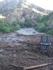 Gould debris basin at a watershed outlet in Los Angeles County, California that has been filled with mud and debris. This photo was taken in 2010 after a major debris flow in the 2009 Station Fire burn area. The metal tower in the foreground is approximately 10 meters high.