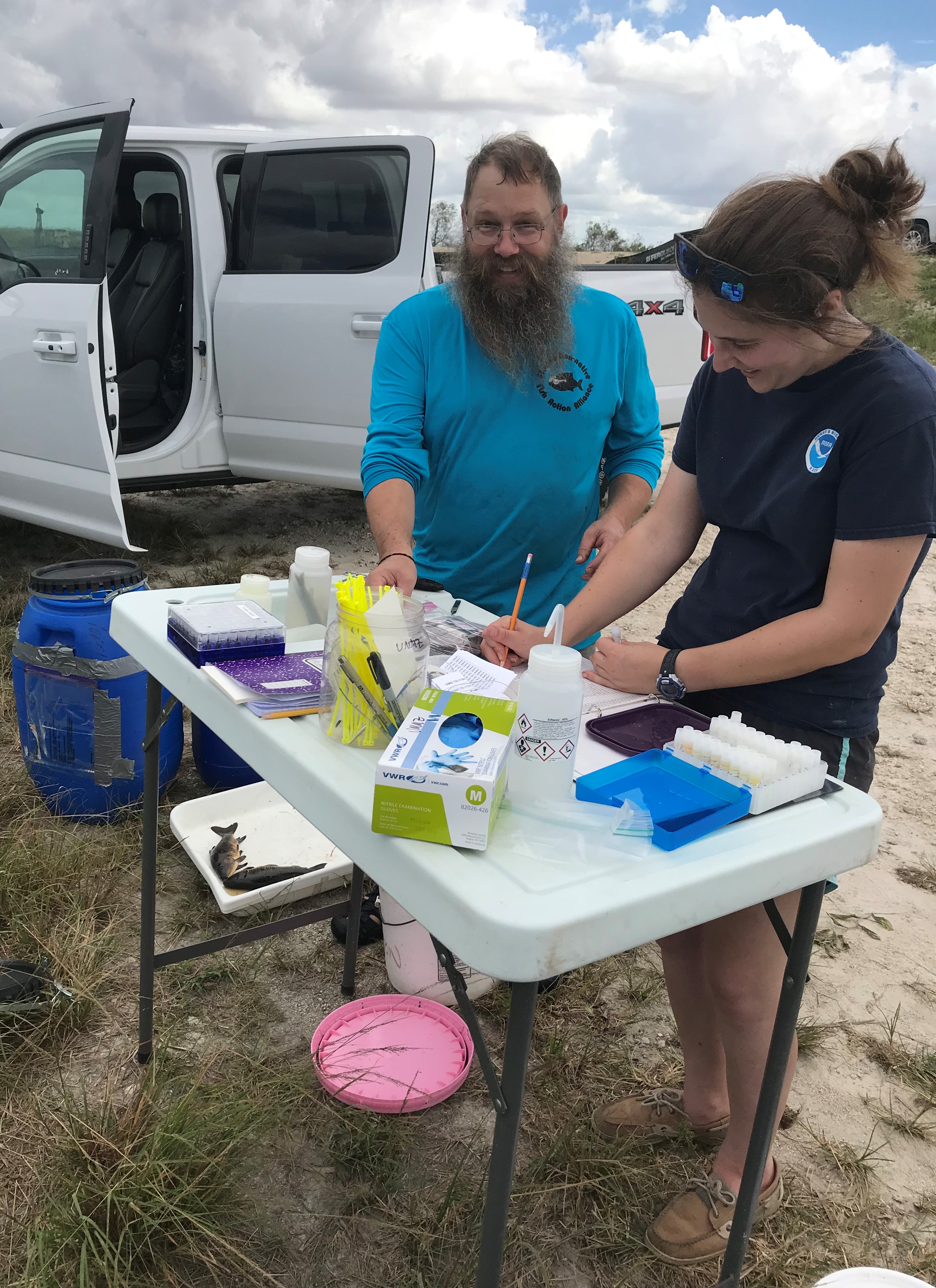 VIMS researchers Dr. Eric Hilton and Dr. Kate Bemis preparing specimens during Fish Slam November 2019