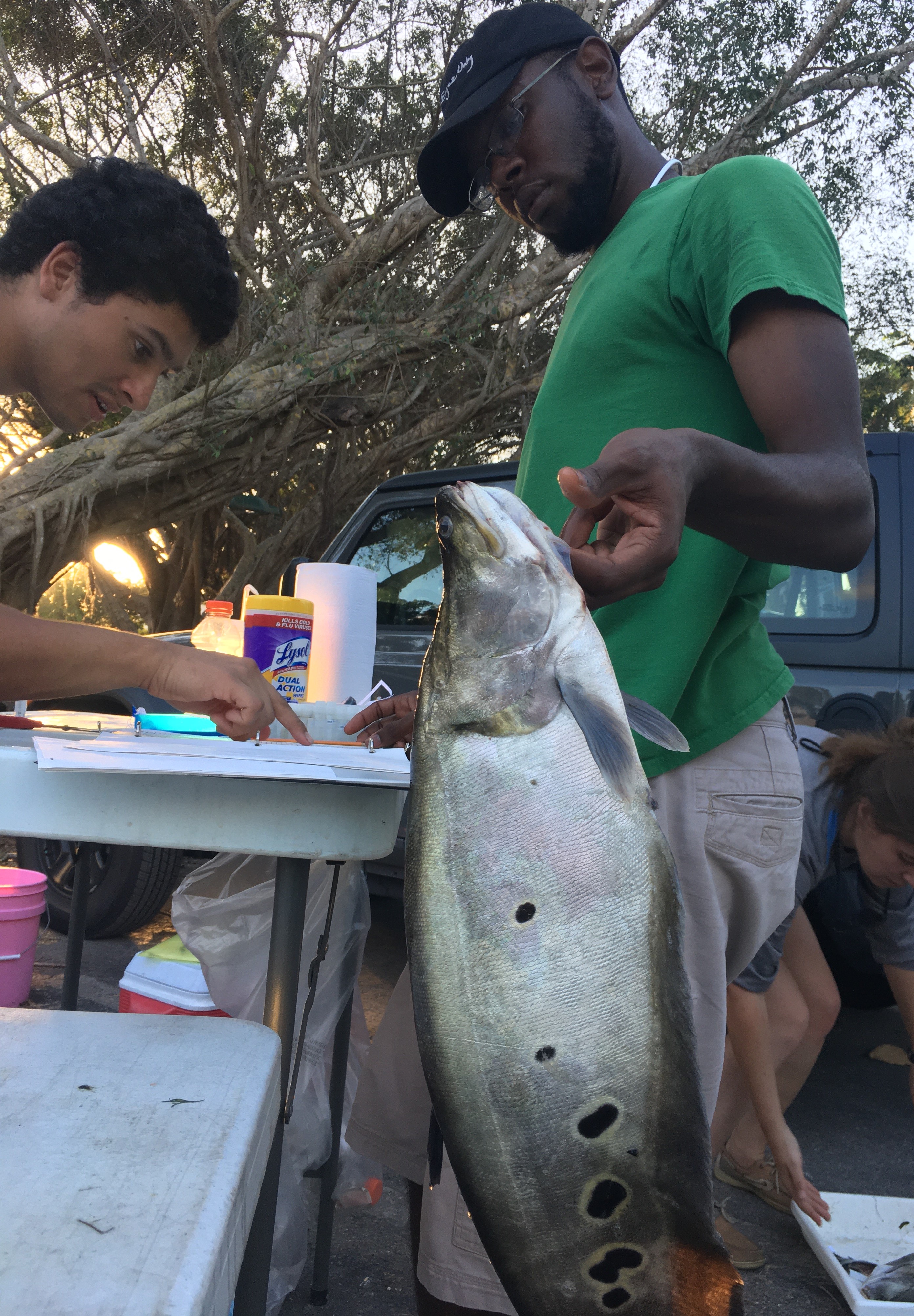 VIMS student Kahlil Russell holds a clown knifefish, Chitala ornata