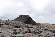 Photo of fissure 7 from Ho'okupu street, looking west. The rampart is surrounded by fissure 8 lava. This view is of the back side of the rampart and fountains erupted on the opposite side of the rampart. Photo by USGS C. Parcheta