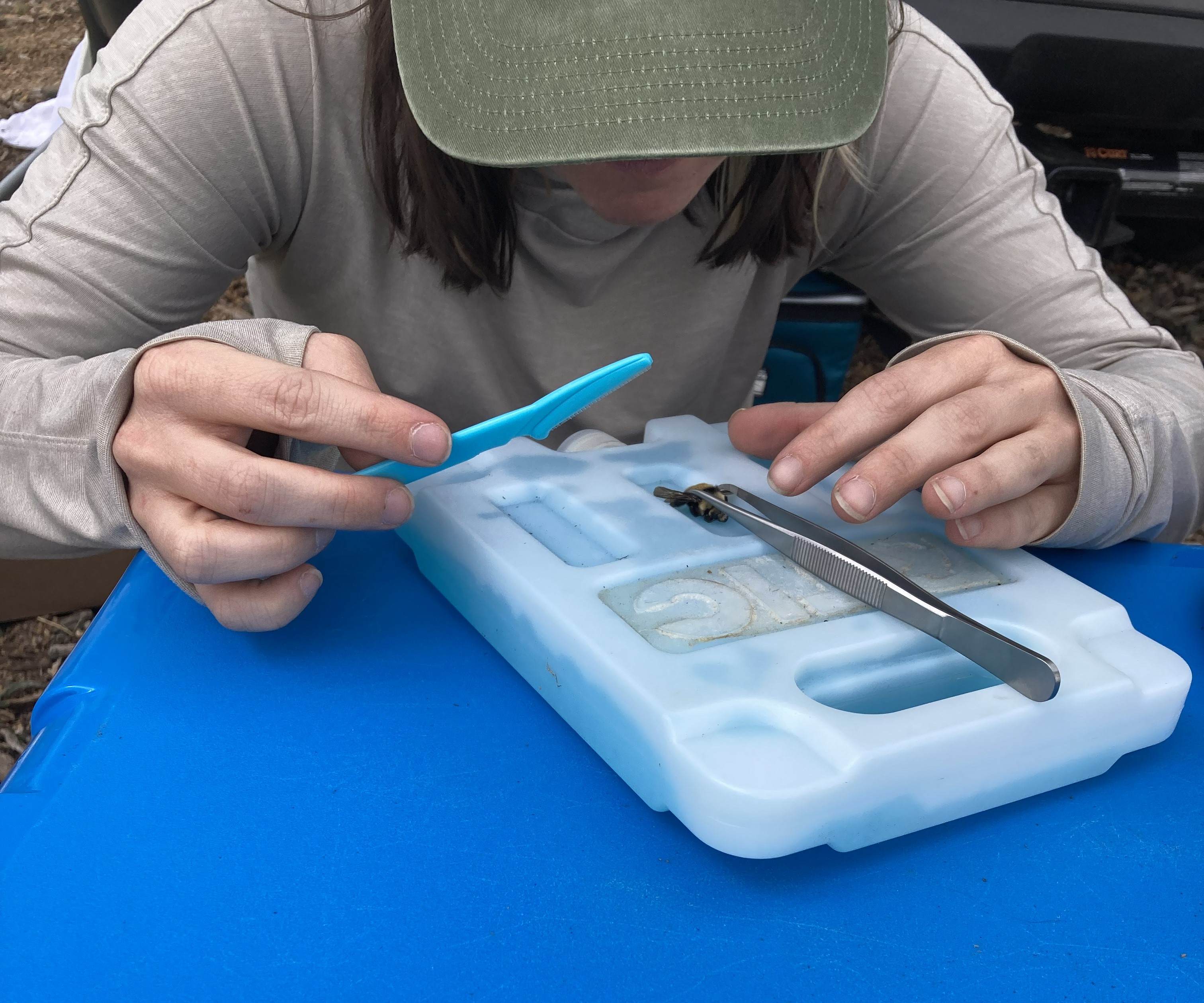 A researcher uses tweezers and to fit a small radio transmitter to a chilled bumble bee, before releasing it back into the wild. Researchers use these radio transmitters to track bumble bee movement and habitat preferences.
