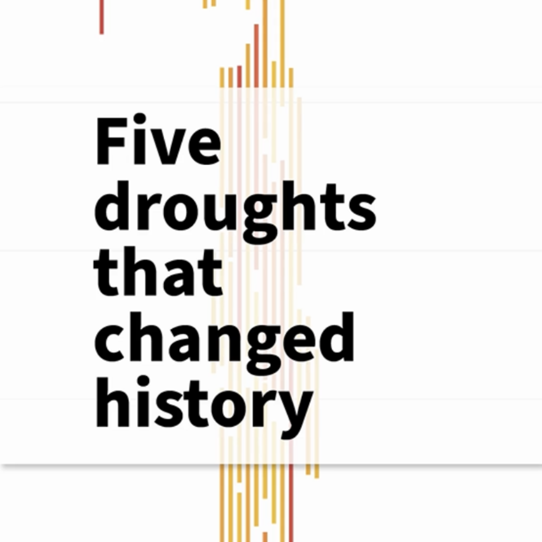 Thumbnail image for Drought Timeline data visualization. Text reads "Five droughts that changed history"