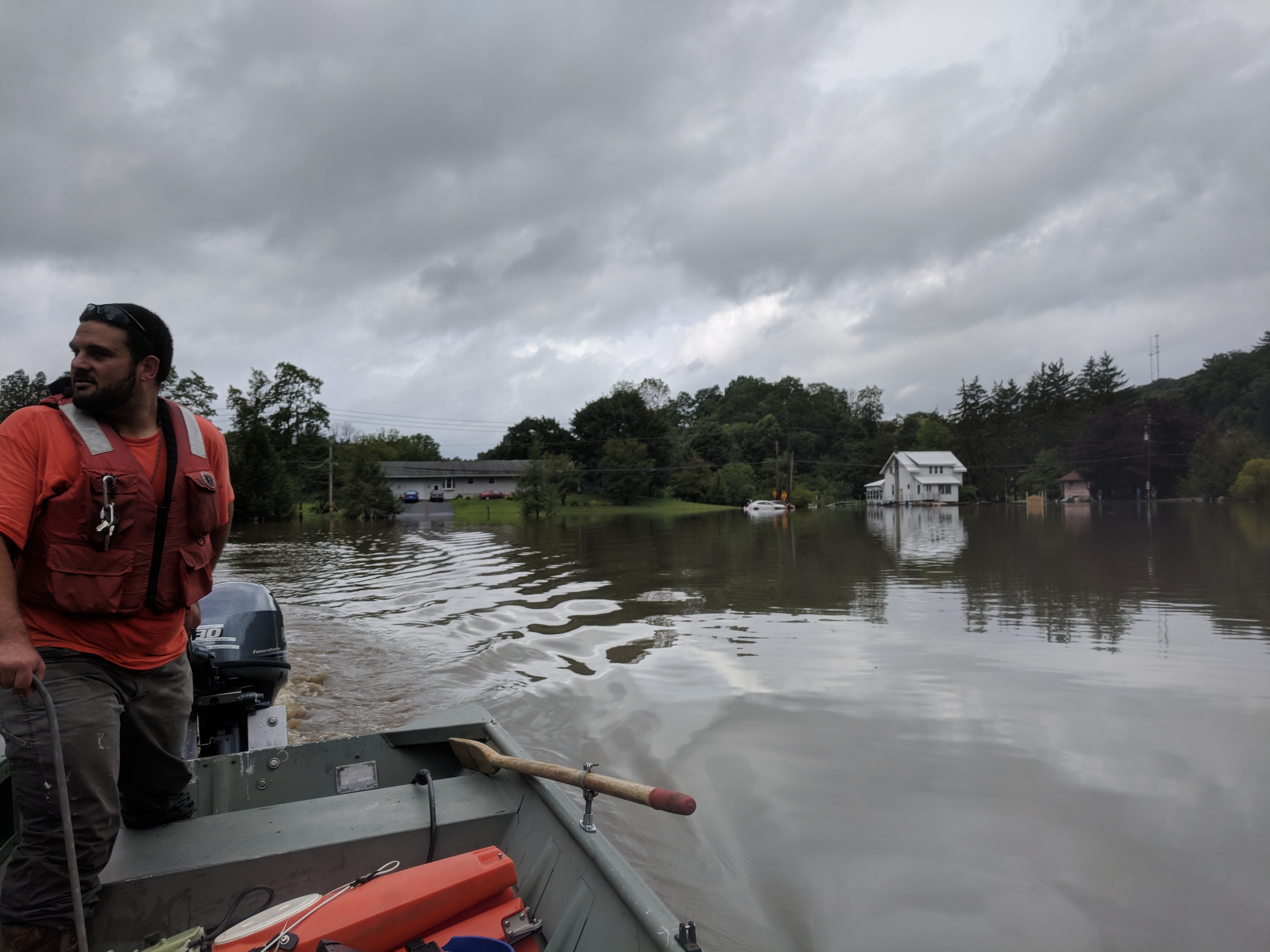 USGS scientists travel by motorboat and kayaks to measure flooding on the Swatara Creek near Pine Grove, Pennsylvania.