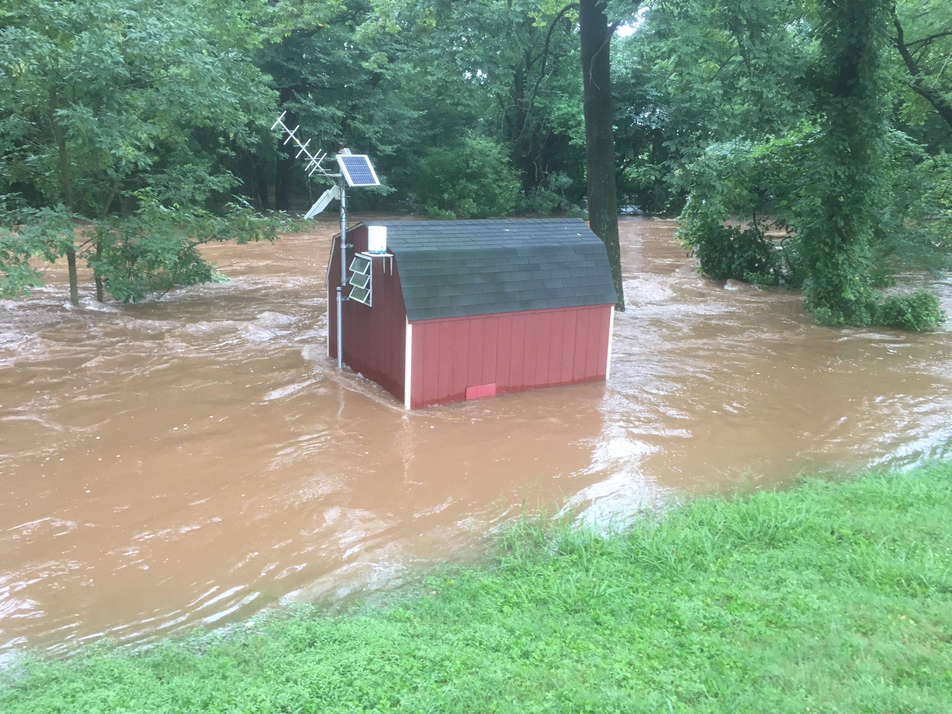 Flooding at the USGS streamgage on Conewago Creek near Falmouth, Pennsylvania. Normal water levels are around 1 foot, and USGS scientists recorded a peak at 13.33 feet following heavy rain in the area.