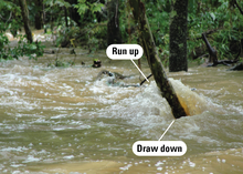 When swift flow encounters obstructions, like this tree, water may run up higher on the upstream side of the object and drawdown lower on the downstream side.