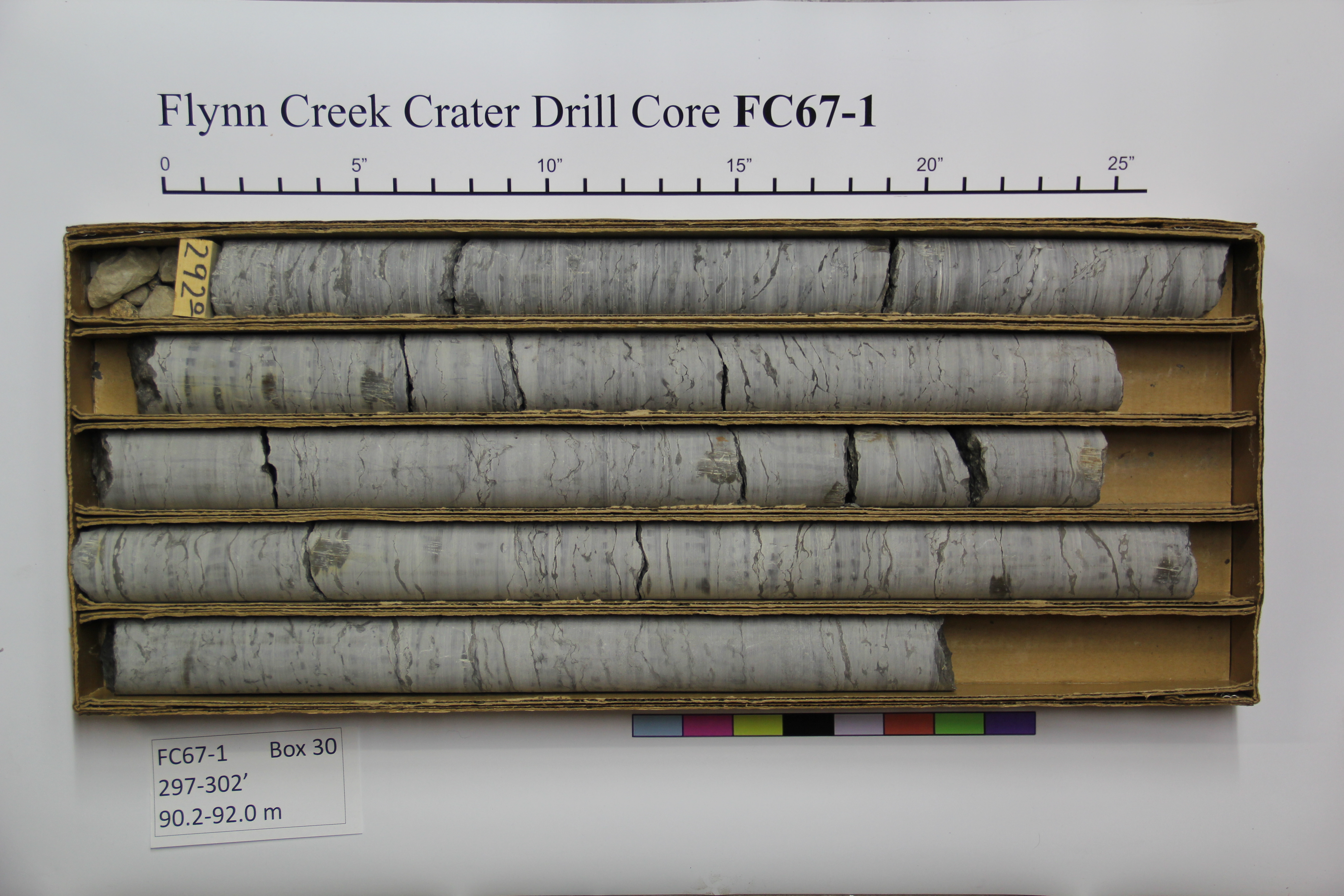 Between 1967 and 1979, USGS scientist Dr. David Roddy conducted a drilling program at Flynn Creek crater. The drilling program produced more than 3.8 km of nearly continuous core from 18 separate drill holes. These samples are now contained in 2,261 standard core storage boxes at the USGS in Flagstaff, Arizona.