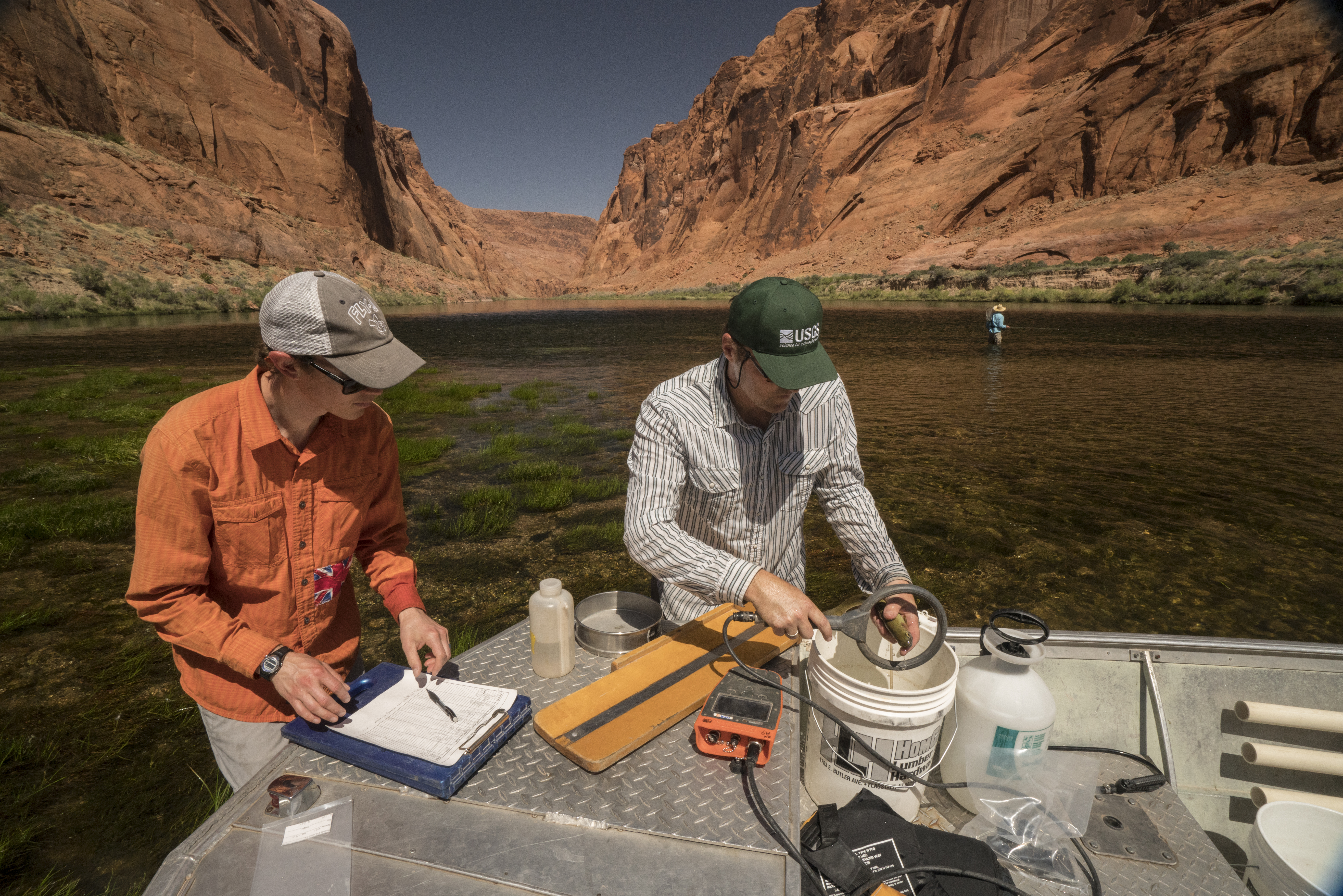 USGS scientists Jeff Muehlbauer and Ted Kennedy process a rainbow trout captured as part of a study to help determine how food web dynamics influence the movement of mercury throughout the Colorado River in the Grand Canyon.