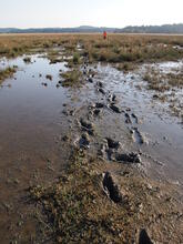 A USGS researcher leaves footprints in the muddy marsh at Willapa National Wildlife Refuge, WA. California-based scientists are studying the effects of sea level rise on this and other tidal marshes along the Pacific coast.