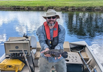 Jonathan Freedman (CNSS) with jaguar guapote, Parachromis managuensis (Photo by Matt Neilson, USGS)