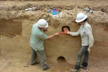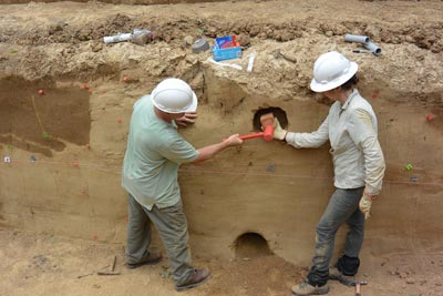 Randall Jibson and Jaime Delano gathering samples from the trench wall.