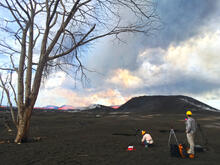 Geology field crew at fissure 8 recording pulsations of lava that exit the vent