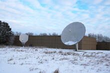 Satellite antennae on site at the USGS Earth Resources Observation and Science (EROS) Center. The larger antenna is used as a backup receiver for NOAA's Geostationary Operational Environmental Satellite (GOES) East satellite.