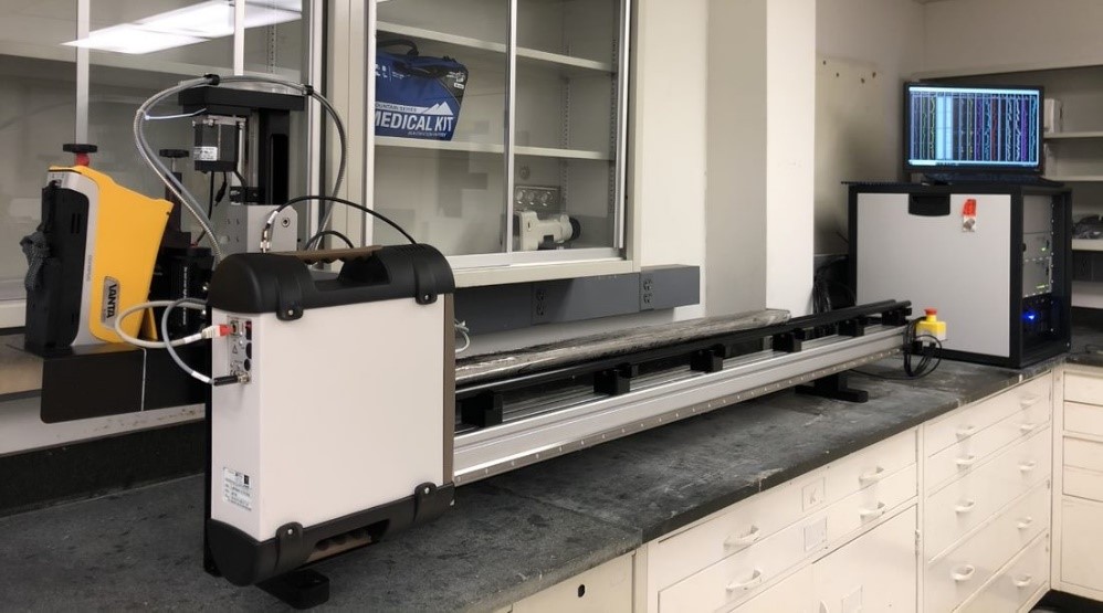 GeoTek MSCL-XZ benchtop setup including (from left to right): Z motor arm carrying XRF, visible and near-infrared spectrophotometer, and magnetic susceptibility point sensor; electronics and motor control unit; monitor displaying real-time data. A sediment core is placed on the track between the Z motor arm (left) and the control unit (right).