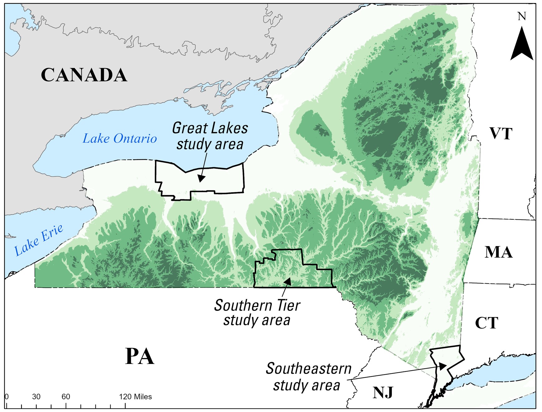 Map of New York State showing the three pilot study areas for interactive products to assist with geothermal drilling.
