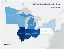 This graphic shows the distribution and total US dollar amount of funding received by each GLGMC member state between 2009 and 2025 since the Coalition has been part of the National Cooperative Geologic Mapping Program.