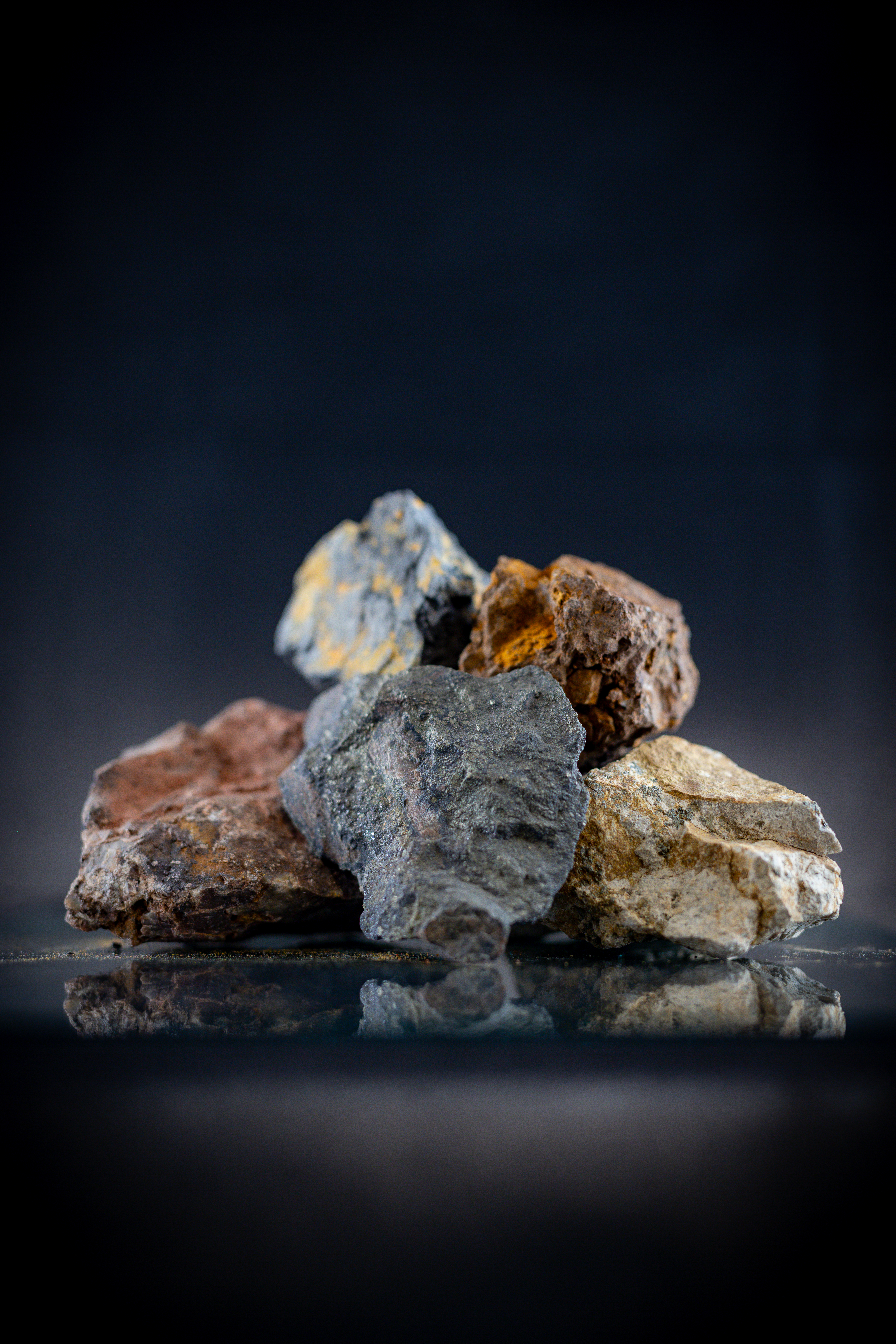 Group of gold ore specimens from the USGS mineral collection. High-definition image showing varied textures and mineral compositions.