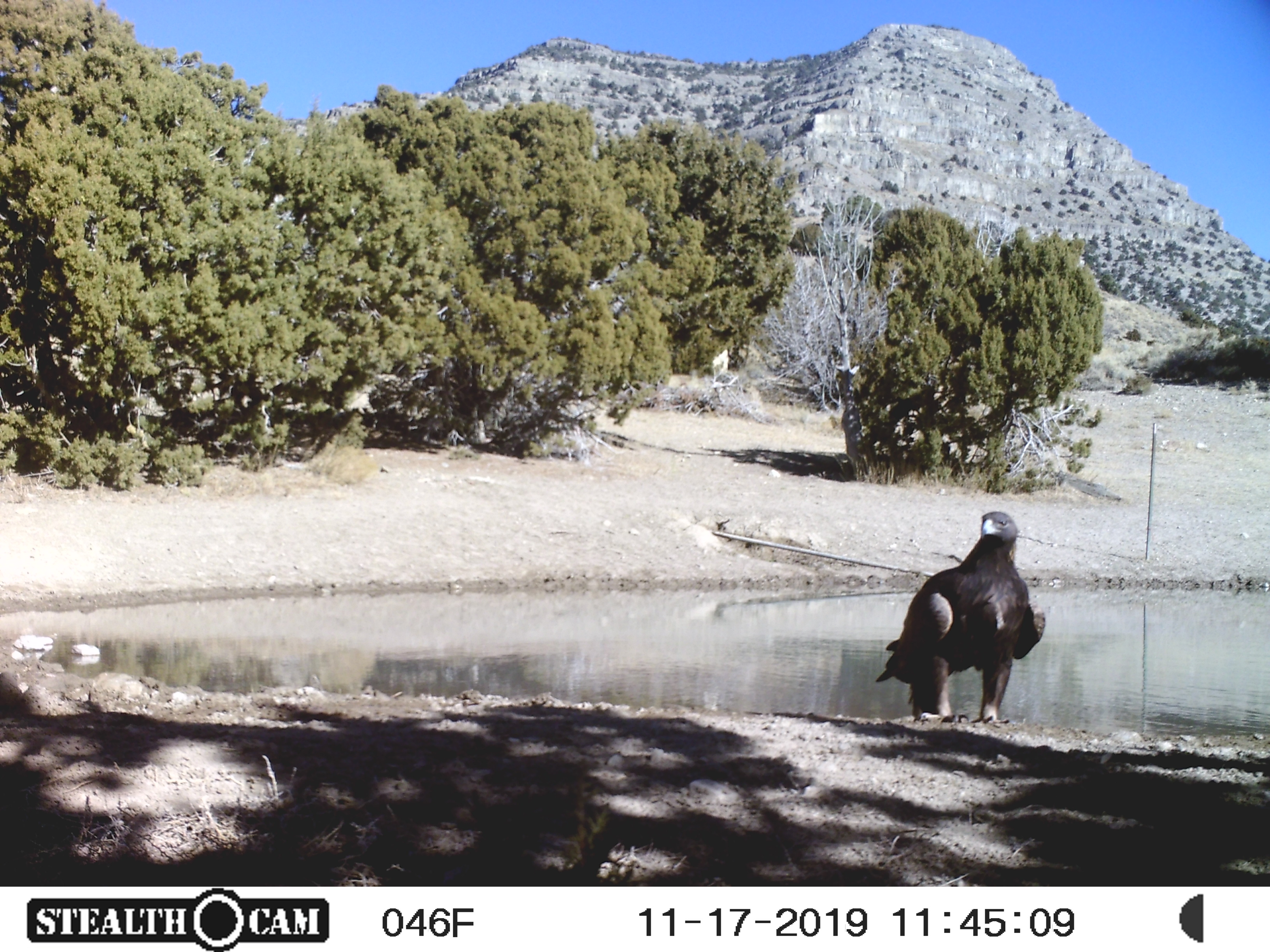 Golden eagle next to pond, captured by a trail camera next to a pond in the Conger Herd Management Area, Utah.