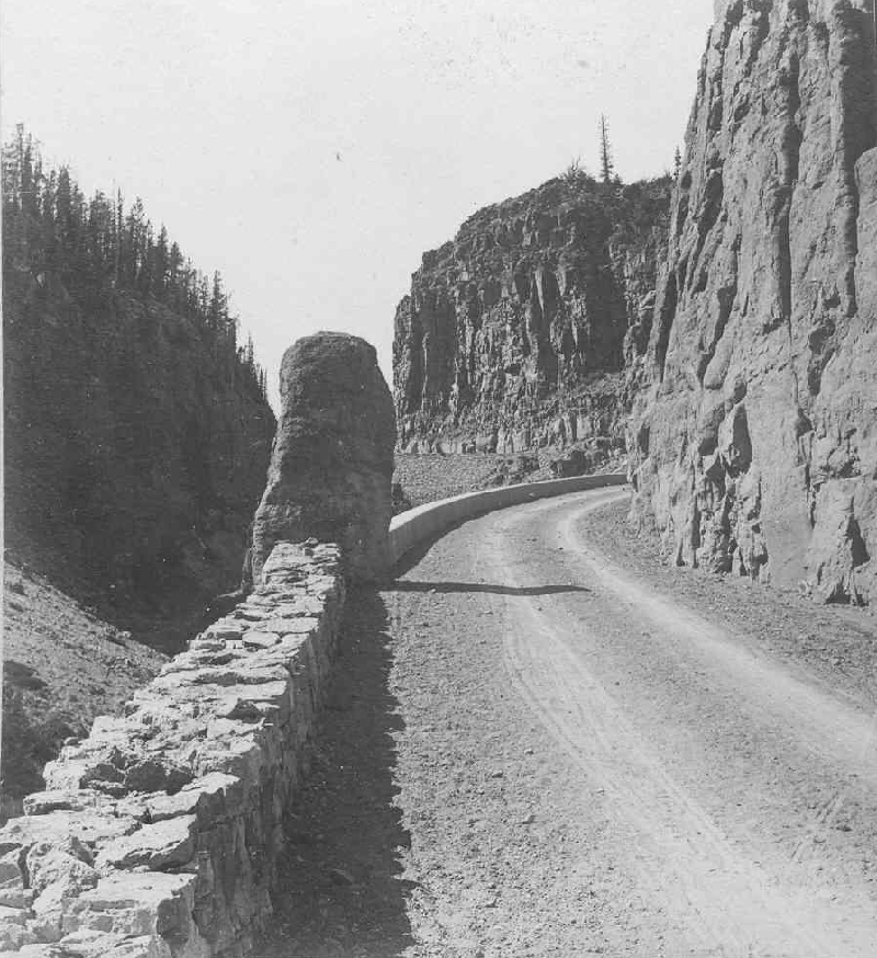 This view is looking up the road through Golden Gate Canyon at a narrow passage known as Golden Gate Entrance. This feature is located several miles east of Mammoth Hot Springs. The rocks exposed in the cliffs are the massive Huckleberry Ridge Tuff (of early Quaternary age, about 2.1 million years (USGS, 2008).