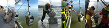 The USGS GOMEX box corer in various stages of deployment and recovery and on different boats.
