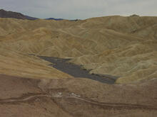 Gray alluvial sediments in the streambed stand out in contrast to the mustard-colored sediments on the slopes.The contrasting streambed gravel is a result of a fairly recent man-made diversion of Furnace Creek into Gower Gulch near Zabriskie Point.