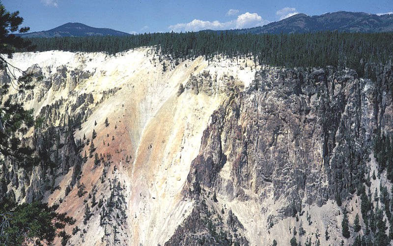 View northward across the Grand Canyon of the Yellowstone from near Point Sublime. Dark cliffs on the right are little-altered rhyolites erupted early in the postcollapse history of the Yellowstone caldera. In contrast, the brightly colored areas to the left reveal the effects of intense hydrothermal alteration of the same rhyolites. The deeper parts of the canyon, including most of the cliffs visible in this view, expose a rhyolite lava flow, the Canyon flow; the cliffs forming a ledge near the top of the cliffs are fused rhyolitic bedded ash-fall tuffs that were so hot as they fell that they welded into dense lava-like rock. The uppermost slopes, largely tree-covered but forming a white rim above the brown and yellow cliffs in the altered part of the canyon, are lacustrine sedimentary rocks, laid down in and near a lake that once filled the caldera before it was drained by downcutting of the Yellowstone River to form the Grand Canyon. Mountains on the skyline beyond the canyon rim are older volcanic rocks of the Absaroka volcanic field that lie outside the Yellowstone caldera.