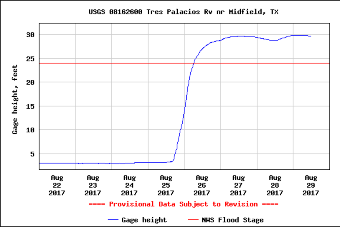 Graph of a USGS streamgage shows a fast spike of floodwater from the heavy rains Hurricane Harvey brought to Texas. Find more information from this gauge here: https://waterdata.usgs.gov/tx/nwis/uv/?site_no=08162600&PARAmeter_cd=00065,00060