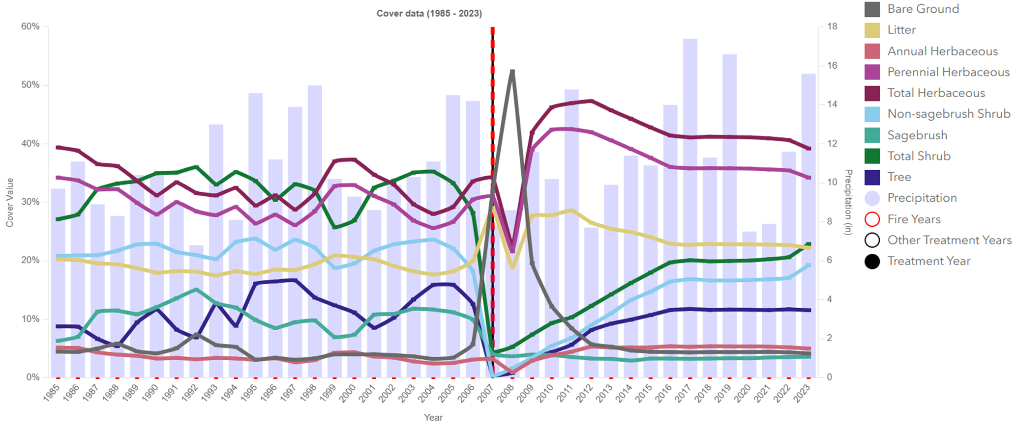 This chart displays annual land cover and rainfall specifically for LTDL treatment polygon areas. Information from these charts can help resource managers understand the long-term vegetation trends from past treatments, alongside the context of annual precipitation and other fire and treatment disturbances. This example is from a post-wildfire treatment. The fire and treatment occurred in 2007, which is delineated with a dashed red line for years of fire and a black line for the year of treatment. Before the fire, the area was dominated by shrubs (totaling ~30%), which plummeted to near zero immediately after the fire event. In the wake of the fire, bare ground briefly spiked to over 50% before being replaced by a surge in herbaceous plant cover, which remained the dominant cover (near 40%). While total shrub cover has steadily recovered to about 22%, it remains below pre-fire levels, and precipitation (shown as background bars) continues to fluctuate annually, influencing these recovery trends.