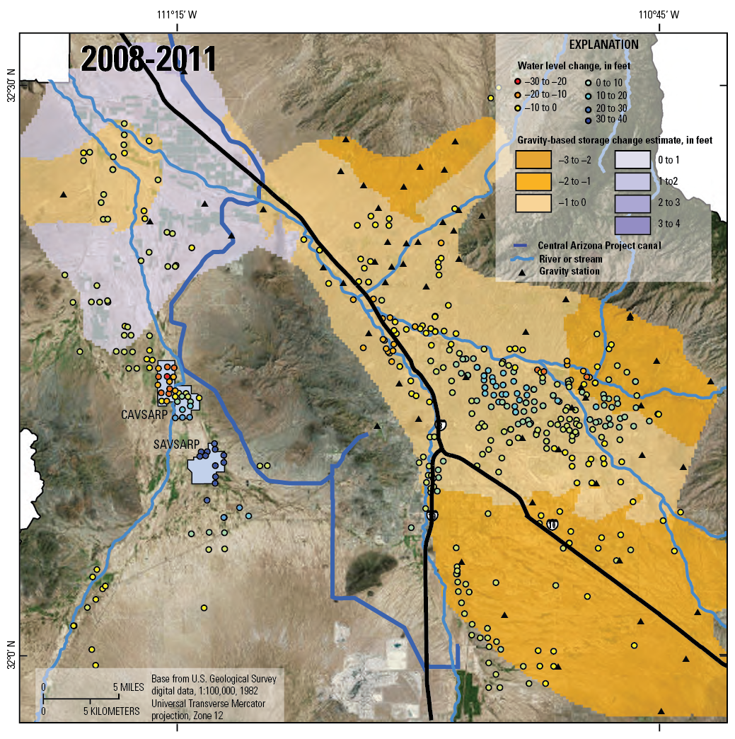 Map showing gravity-based groundwater-storage and water-level change in a portion of the Tucson AMA, from spring 2008 to summer 2011.