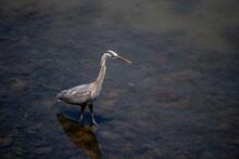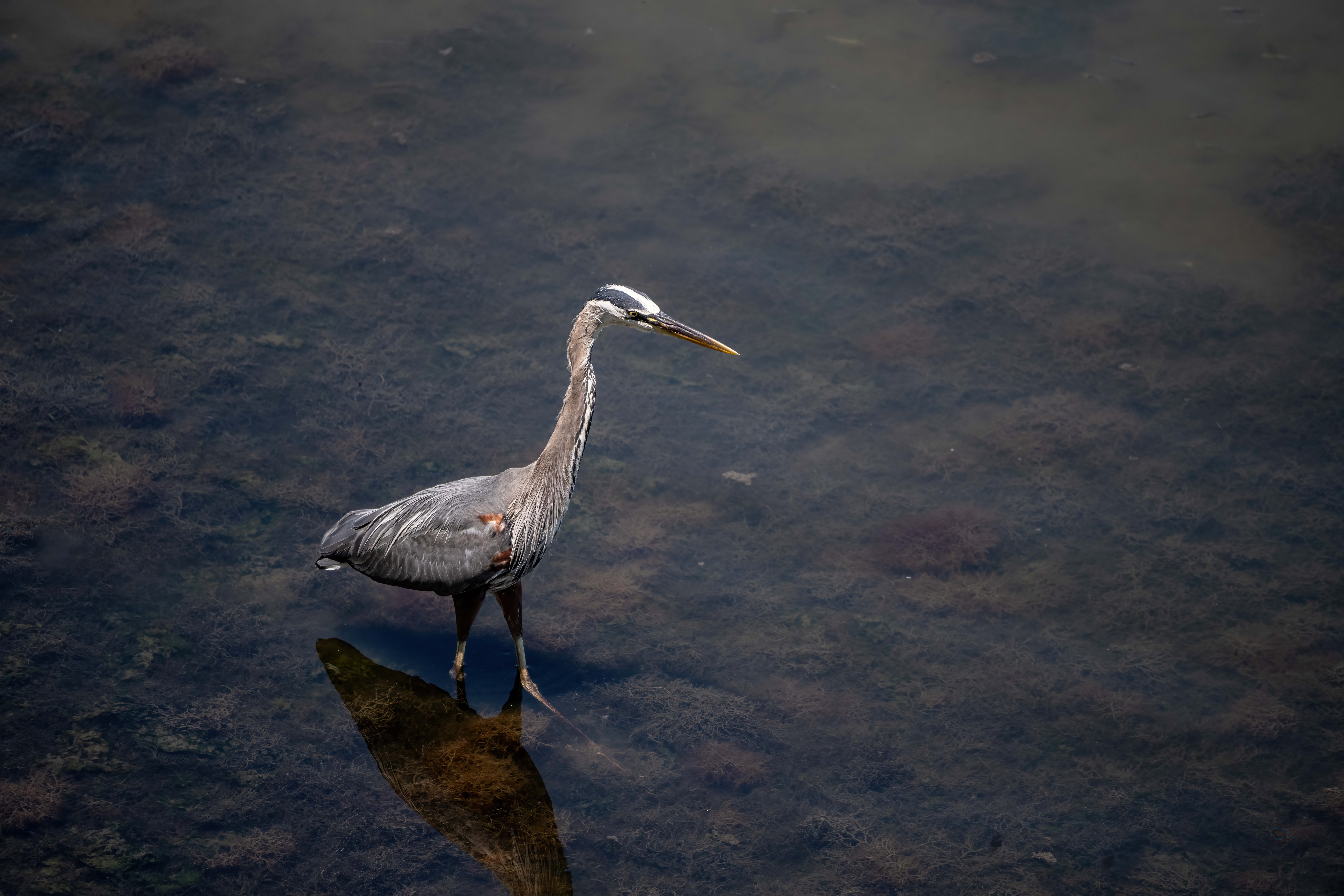 The great blue heron (Ardea herodias) is a large, wading bird known for its striking blue-gray plumage, long legs, and graceful demeanor, commonly found near water bodies across North America. This one was photographed in Ocean City, MD.