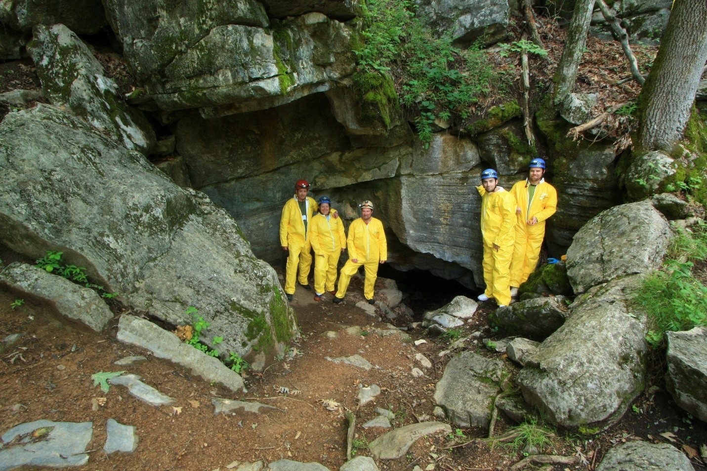 A group of USGS scientists outside a cave in Great Smoky Mountains National Park. Their research studies the effects of a certain fungus on salamander populations. Photo by Alan Cressler/USGS
