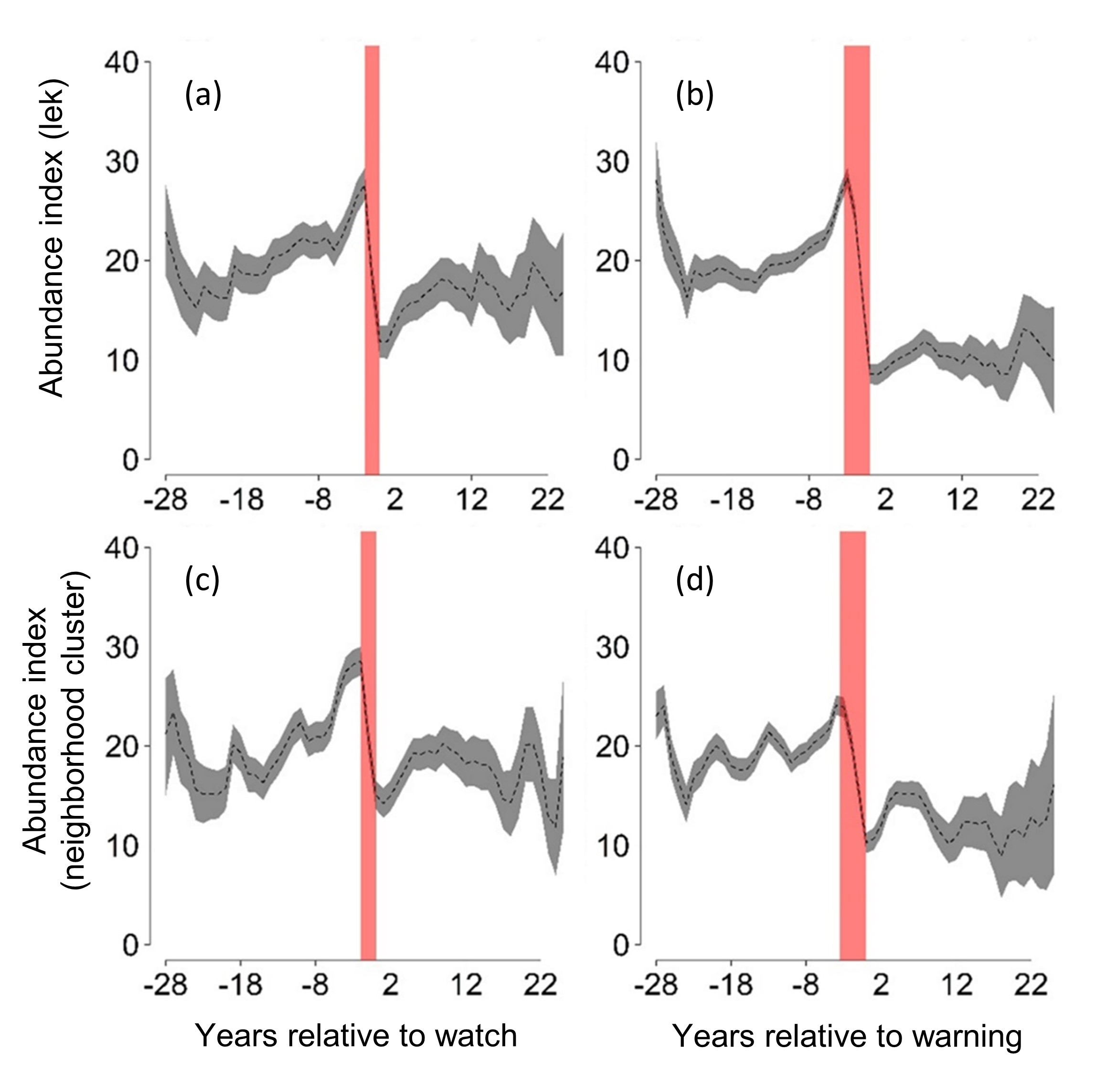 Greater sage-grouse (Centrocercus urophasianus) abundance index (dashed line) relative to scales of management action (lek [breeding site], neighborhood cluster). Time represents years before (negative values) or after (positive values) watches (left column) and warnings (right column) occurred. Red polygons represent years during which thresholds were crossed (that is, signal activated), which lead to a watch or warning. Gray areas represent credible intervals of abundance index.