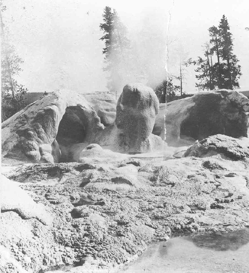 The unusual siliceous sinter deposits around the geyser are about 8 feet high. They are forming from the splashing of water during eruptions that, in turn, evaporates, leaving behind the mineral deposits. Click here to see a recent photograph of Grotto Spring.