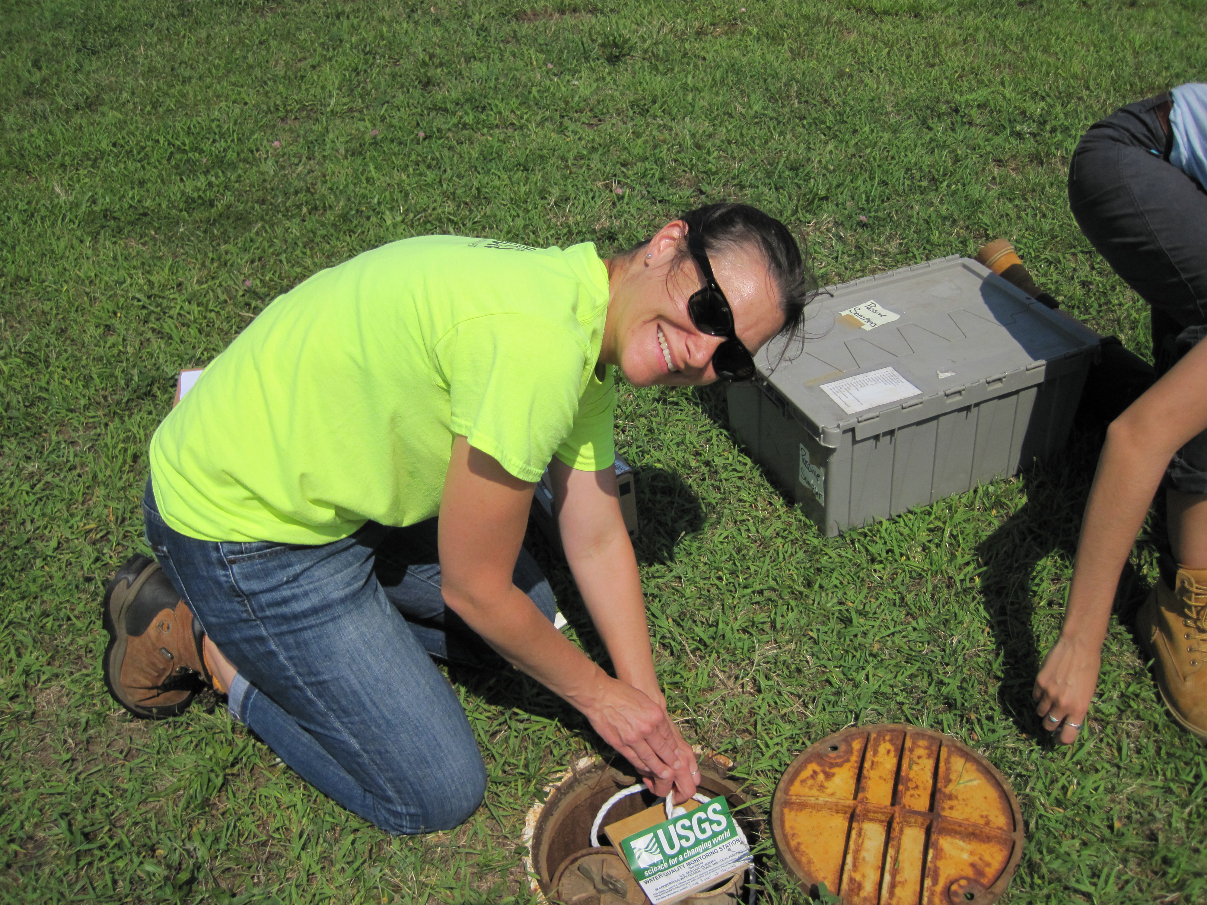 Irene Fisher (USGS Hydrologist) installs groundwater monitoring instrument.