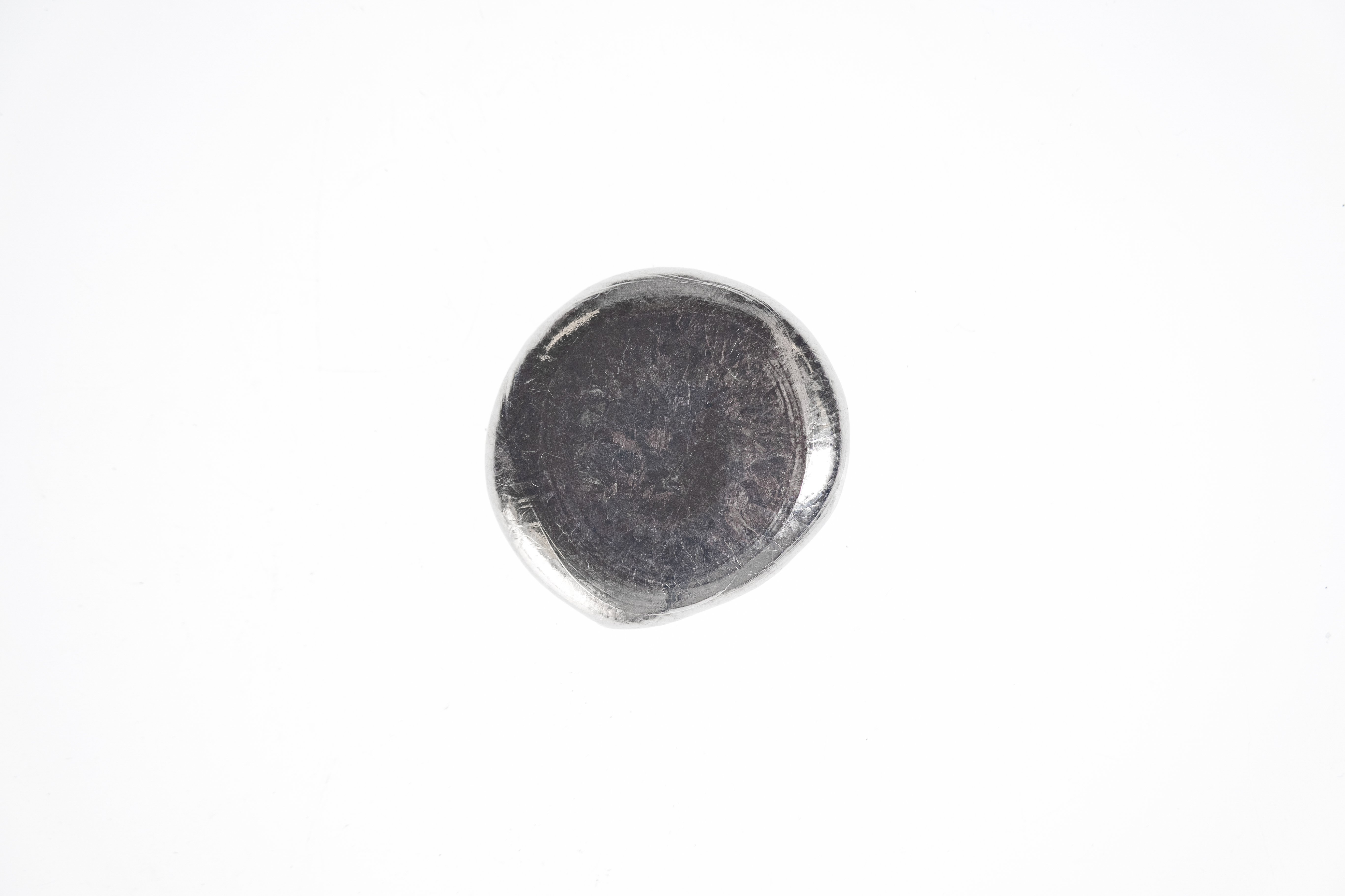 Isolated hafnium specimen from the USGS mineral collection. High-definition image showing metallic luster and smooth surface.