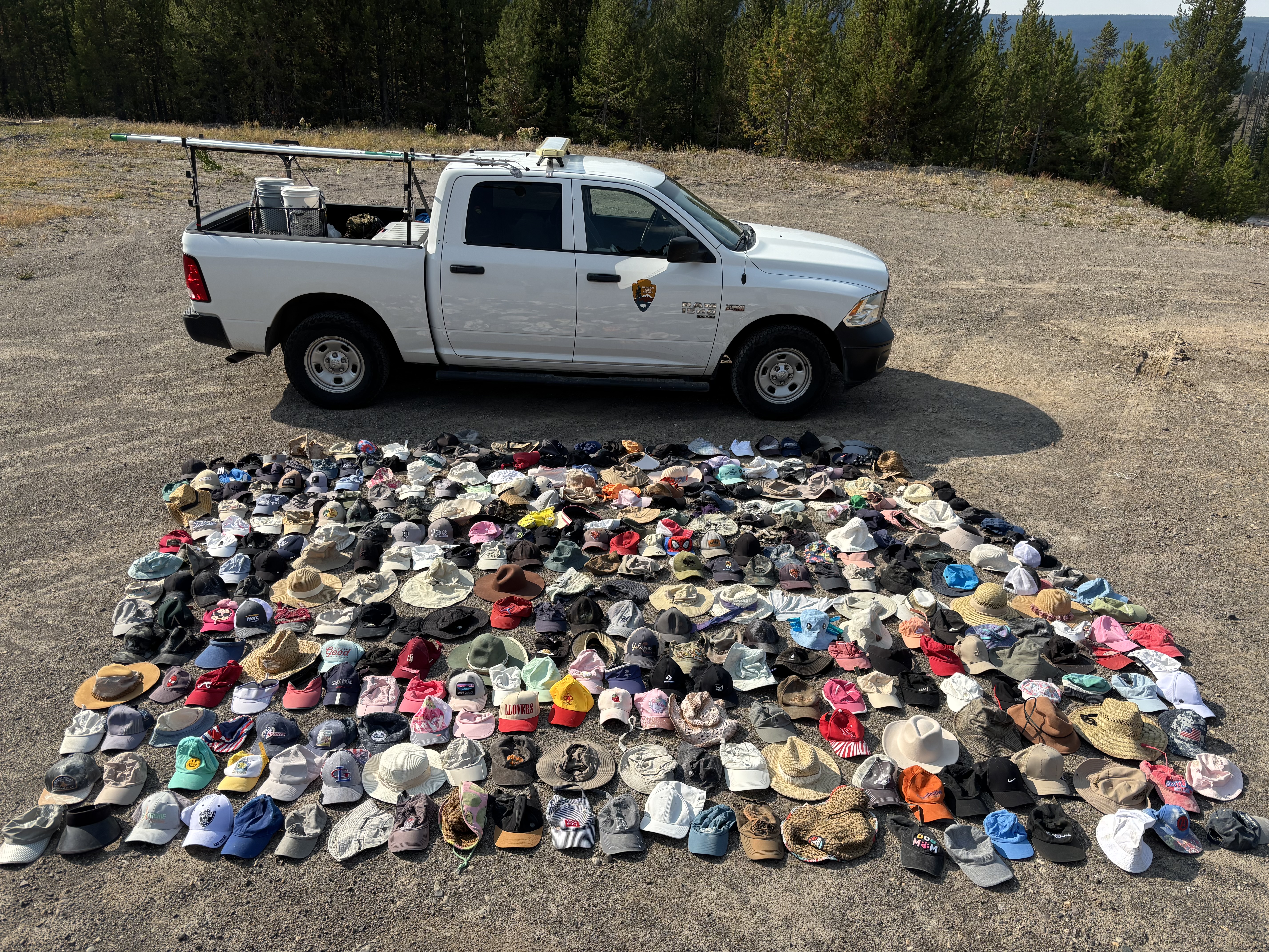 Just some of the hats collected by the Yellowstone National Park Geology Program from sensitive thermal areas throughout the park in 2025. National Park Service photo by Margery Price, September 3, 2025.