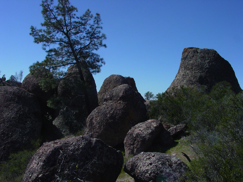 Barren outcrops of rock (in this case, the volcanic rock, rhyolite tuff) shows that physical erosion on the surface is removing weathering material before it can form soil. This pattern is common in semi-arid regions where long periods of drying occur between episodes of heavy precipitation. This is typical of higher elevations in regions with Mediterranean climates like the Coast Ranges of California (Scarciglia and others, 2007).
