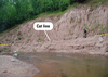 A USGS hydrographer prepares to survey a cut line in a sand/clay bluff. The cut line can be seen along the edge between the rough surface with vertical gullies on the upper part of the bluff and the smoother, horizontally eroded surface below where the floodwaters were.