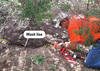 A hydrographer flags a wash line that was created when floodwaters removed a thick bed of needles revealing the soil underneath.