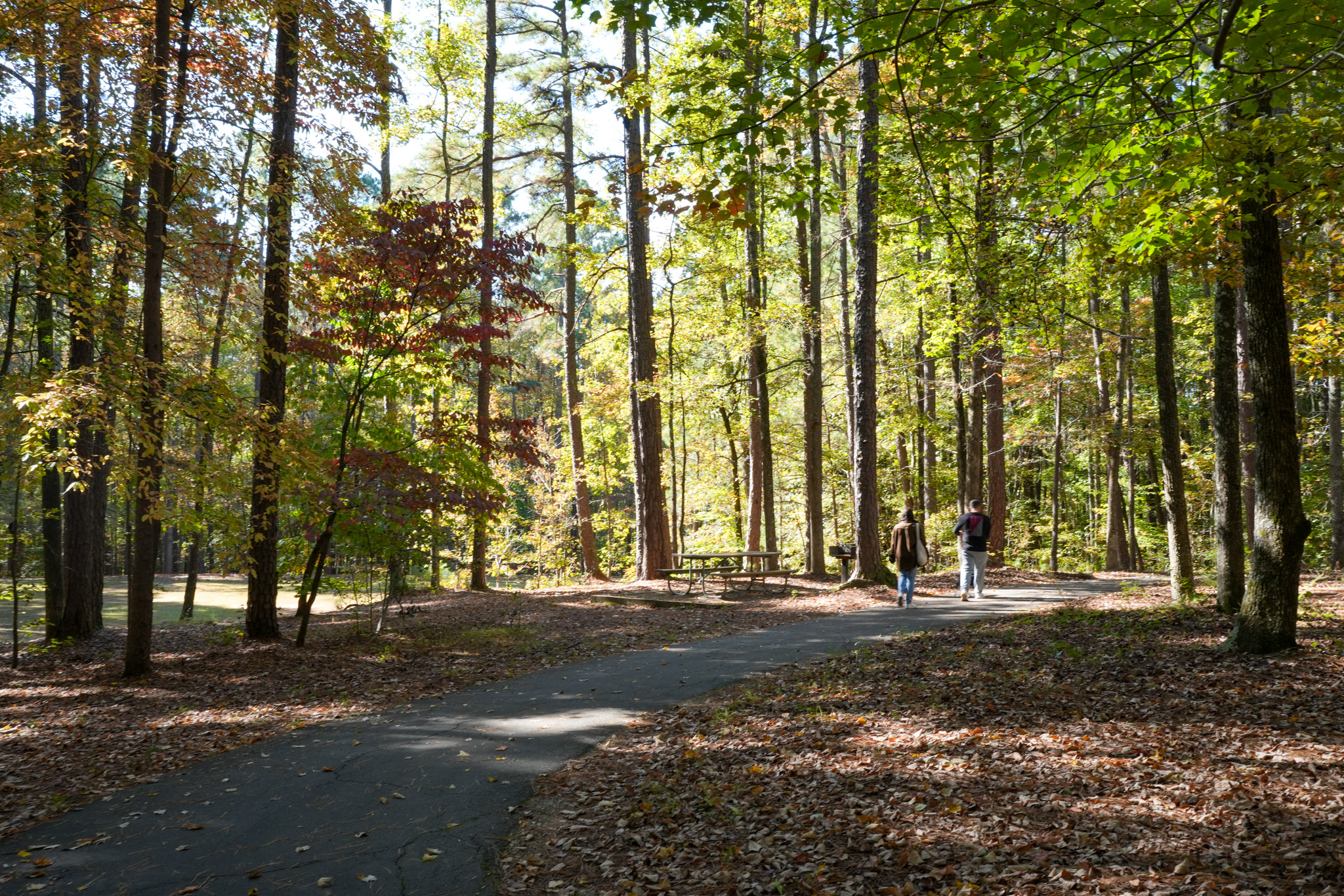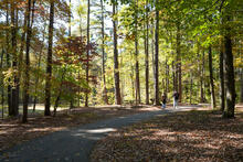 Hikers walking through William B. Umstead State Park in Raleigh, North Carolina in the fall.