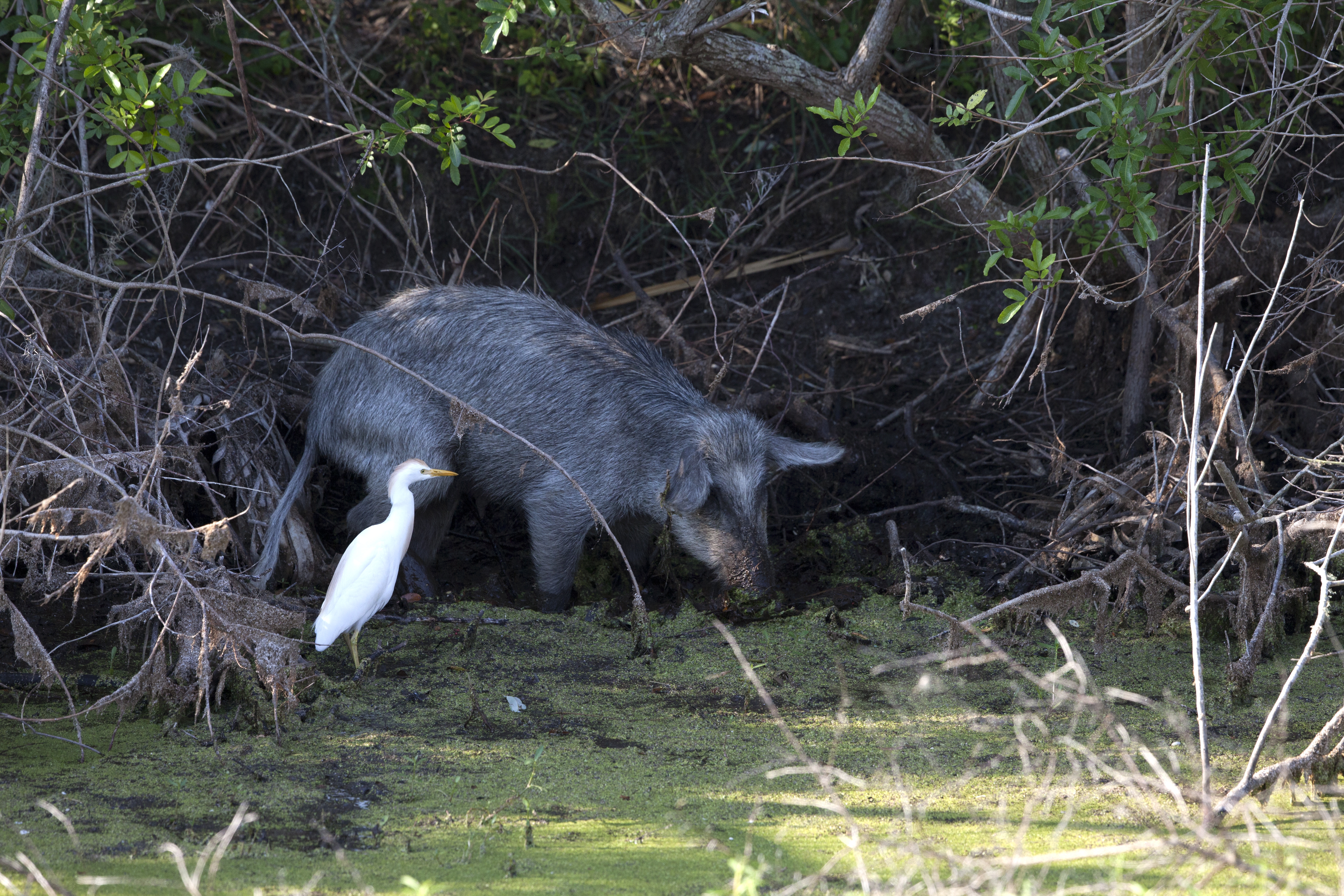 A wild pig finds food in the underbrush at NASA's Kennedy Space Center in Florida.