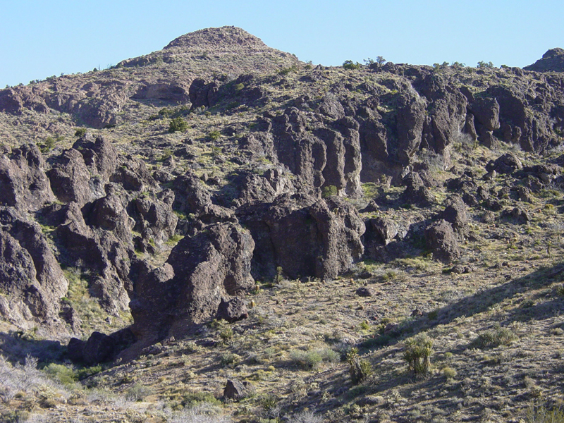 Hoodoos (rocky pillars) of basaltic tuff along the Wild Horse Canyon Road near Hole-In-The-Wall in the Mojave National Preserve. Volcanic rocks in this vicinity are deposits of volcanic material ejected from the nearby Woods Mountain volcanic center that formed in Middle Miocene time, around 16 million years ago (McCurry, 1988).