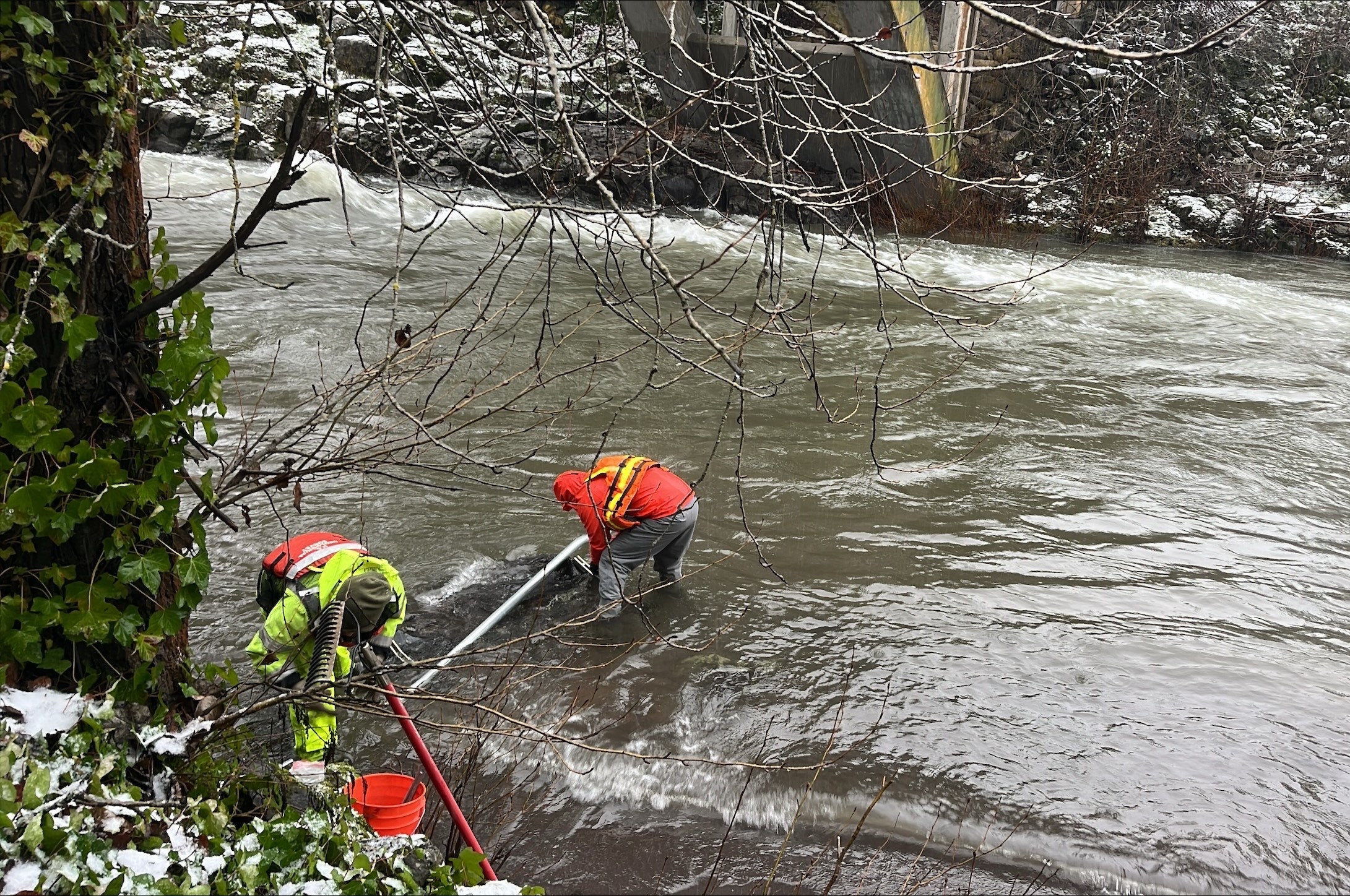 The original orifice was damaged in last week’s high flows, and another flood was underway, so restoring data quickly was critical. This site is a key flood location for National Weather Service forecasts and public use, including kayakers. The temporary fix provided real-time data during rapidly changing conditions, and several kayakers expressed appreciation. The Hood River at Tucker Bridge, near Hood River, OR streamflow gage (# 14120000) is operated in partnership with the US Department of Energy - Bonneville Power Administration.