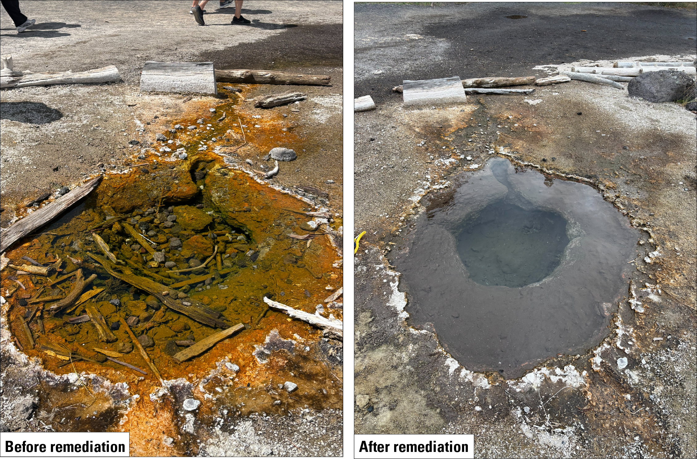 Hot spring along trail to Grand Prismatic Spring overlook before and after remediation