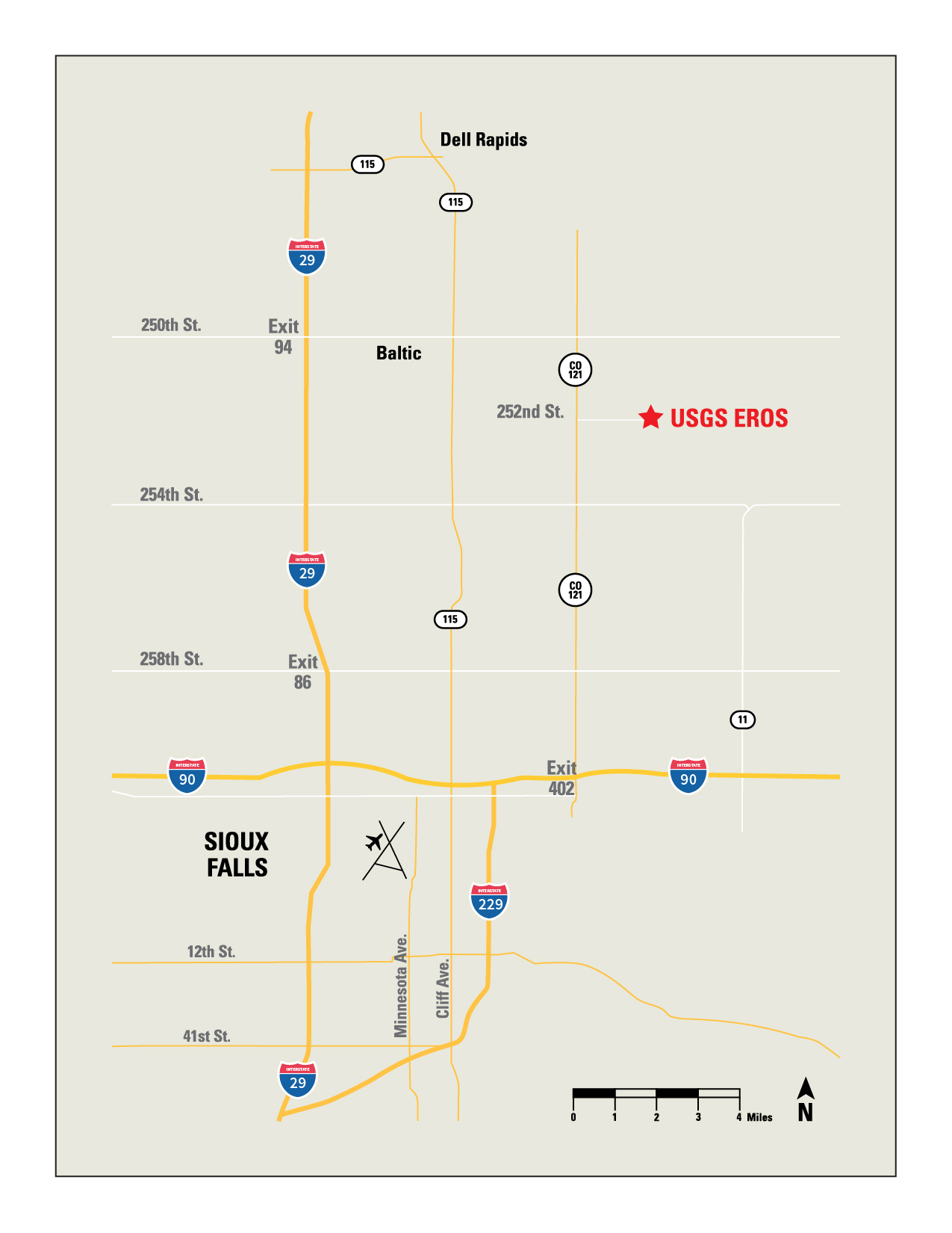 A map showing how to find the Earth Resources Observation and Science Center from Sioux Falls, South Dakota.
