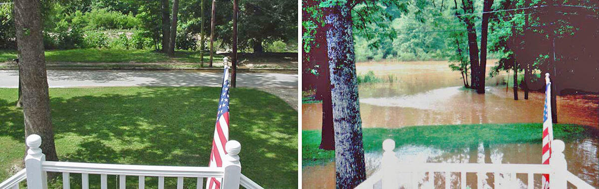 Picture showing a yard alongside Peachtree Creek, Atlanta, Georgia during a dry period and also during a flood.
