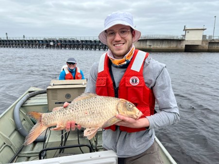 Howard Jelks (USGS-volunteer) and Ethan Reynolds (UMMZ) with common carp, Cyprinus carpio (Credit: Randy Singer, UMMZ).