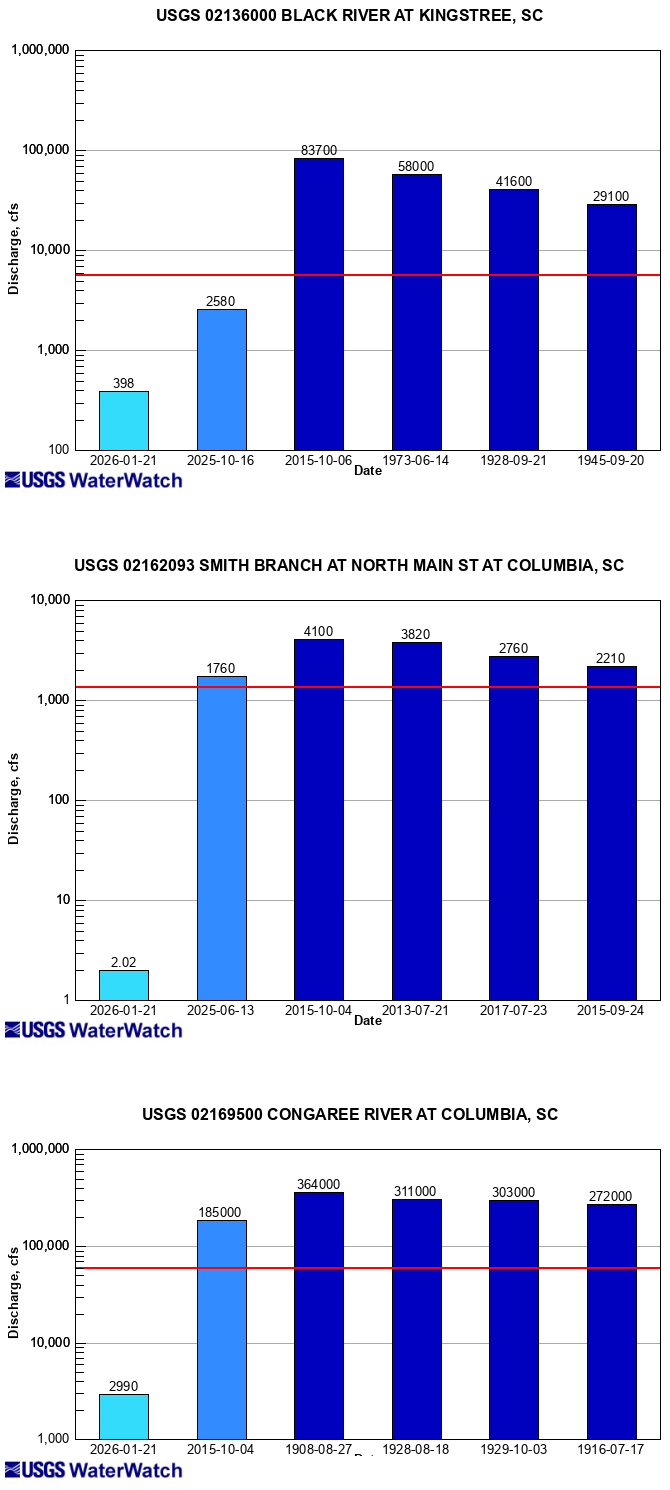 Peak discharges recorded during Hurricane Joaquin (early October 2015) compared to historical peaks for three sites in South Carolina. The left-most value represents the current discharge on the day these charts were exported, January 21, 2026. For the Black River at Kingstree, SC (02136000) and Smith Branch at North Main St at Columbia, SC (02162093) streamgages, the Hurricane Joaquin flow remains the highest recorded peak ten years later.