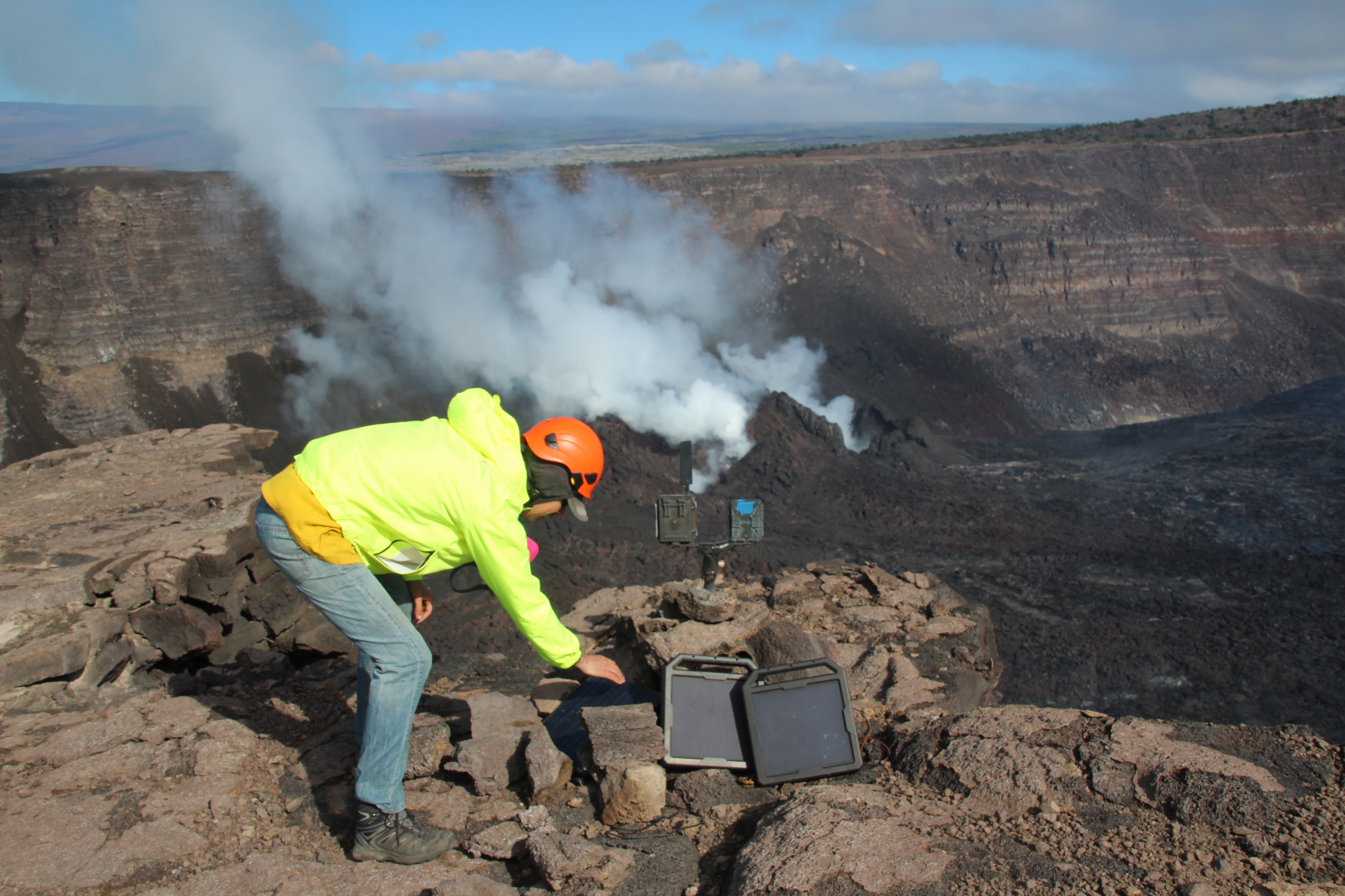 On March 12, a USGS Hawaiian Volcano Observatory geologist on the southwest rim of Kaluapele (Kīlauea summit caldera) serviced the S2cam webcam. A plume of water vapor and volcanic gas rises from the two vents of the ongoing eruption within Halema‘uma‘u crater, one day after the 13th episode of the eruption. USGS photo by N. Deligne.